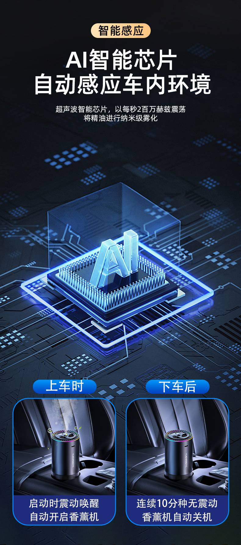7. Sensing pintar AI Cip pintar secara automatik merasakan cip pintar ultrasonik dalam persekitaran kereta, dan atomisasi minyak pati di nanoscale dengan getaran sebanyak 2 juta hertz sesaat